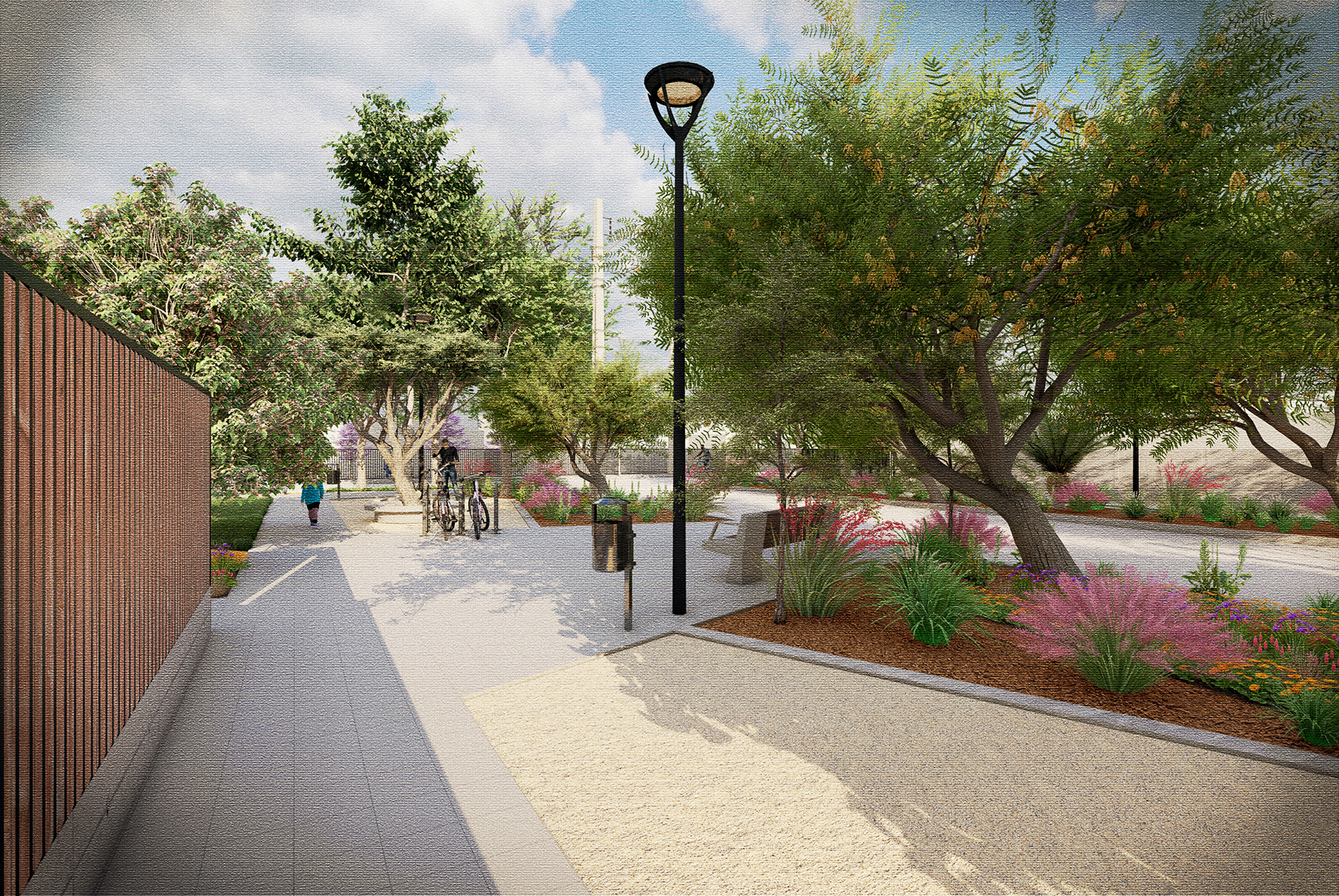 La propuesta promueve un paisajismo de bajo consumo hídrico, utilizando una paleta de vegetación de tipo xerófita y de preferencia nativa. En consecuencia, se trabaja con mulch como cobertura de las zonas plantadas y sistema de riego tecnificado por goteo para optimizar el recurso hídrico y conservar el agua de riego.