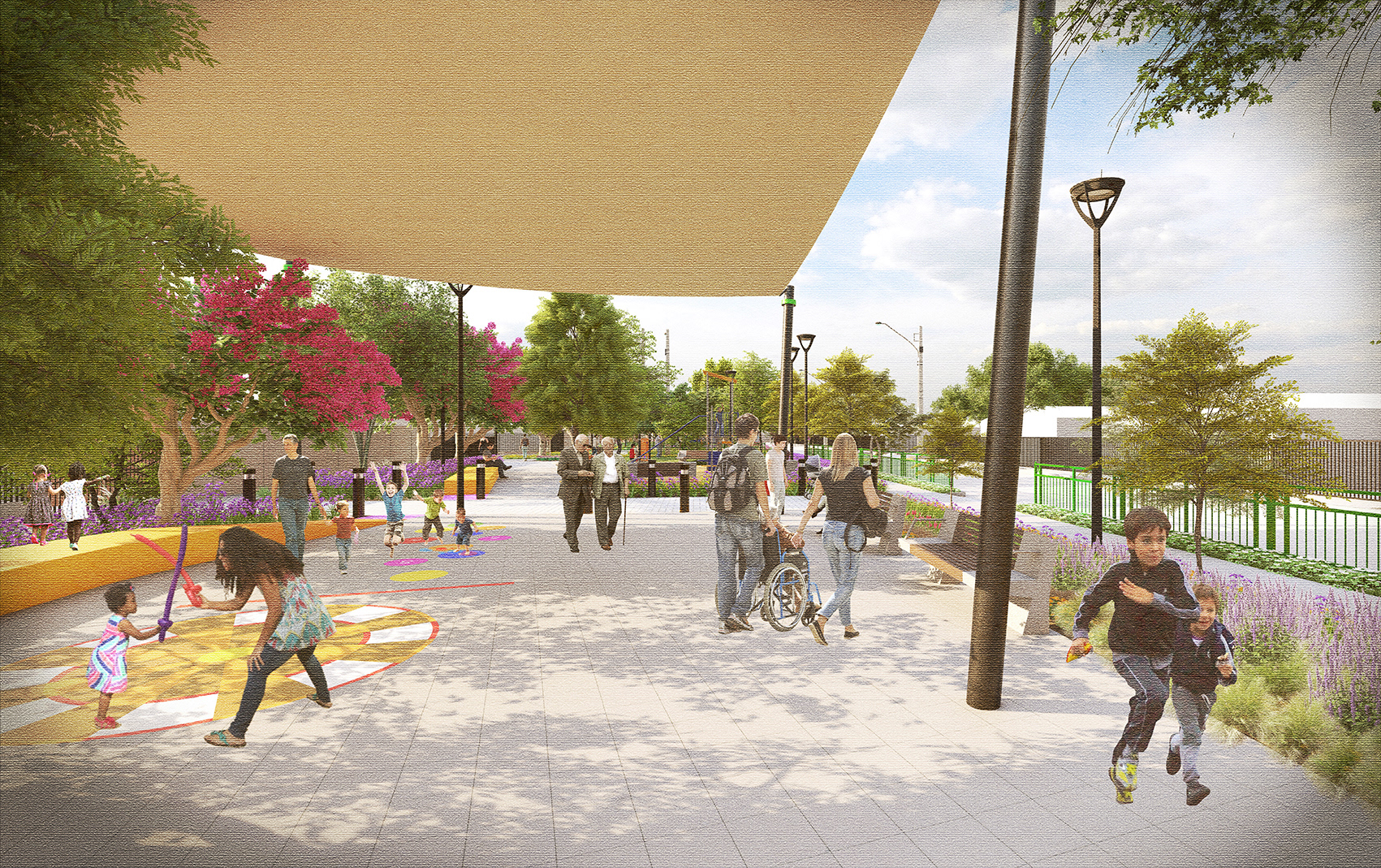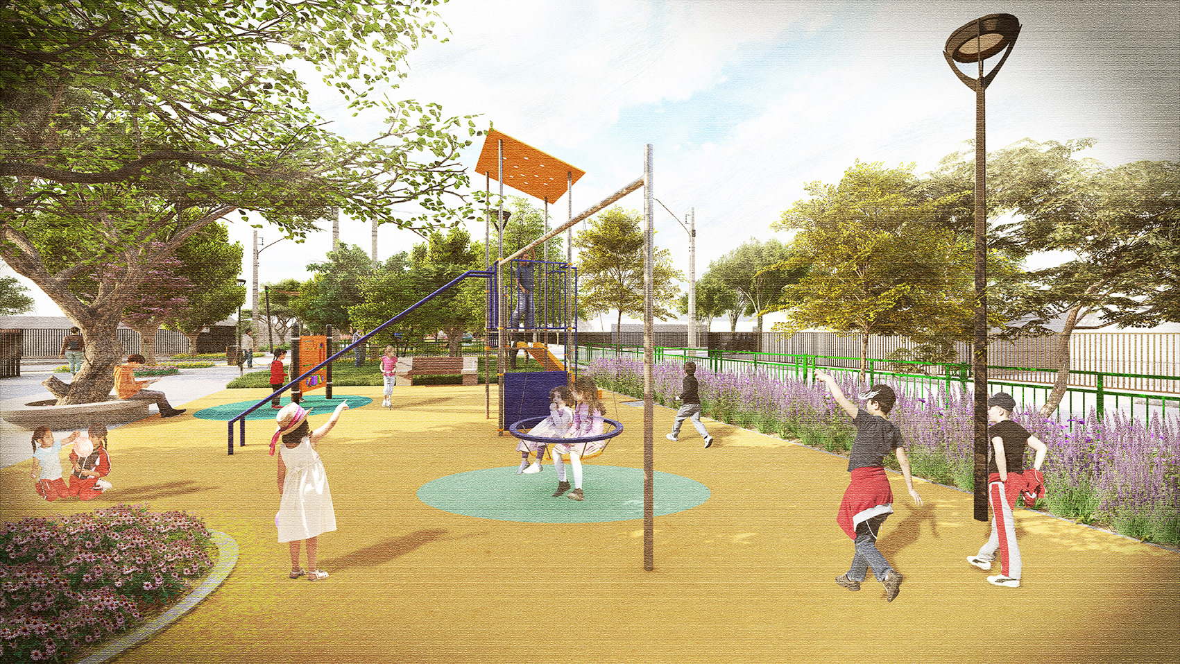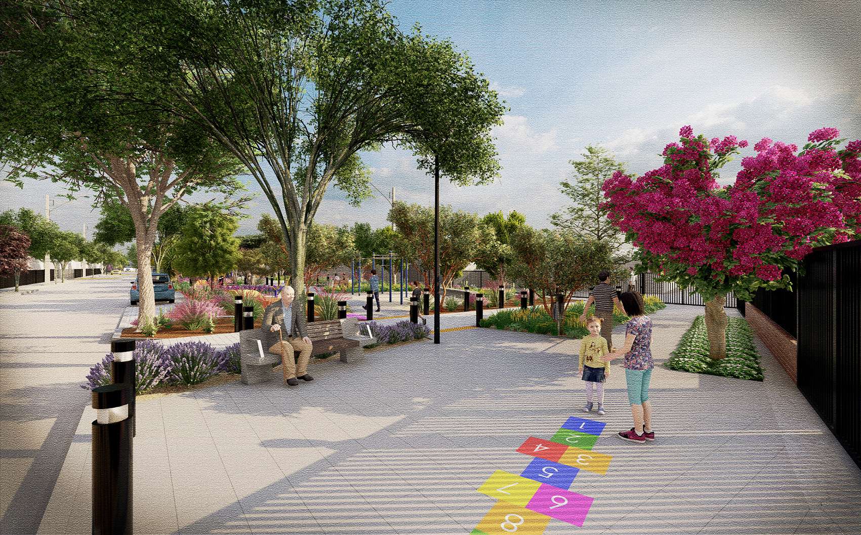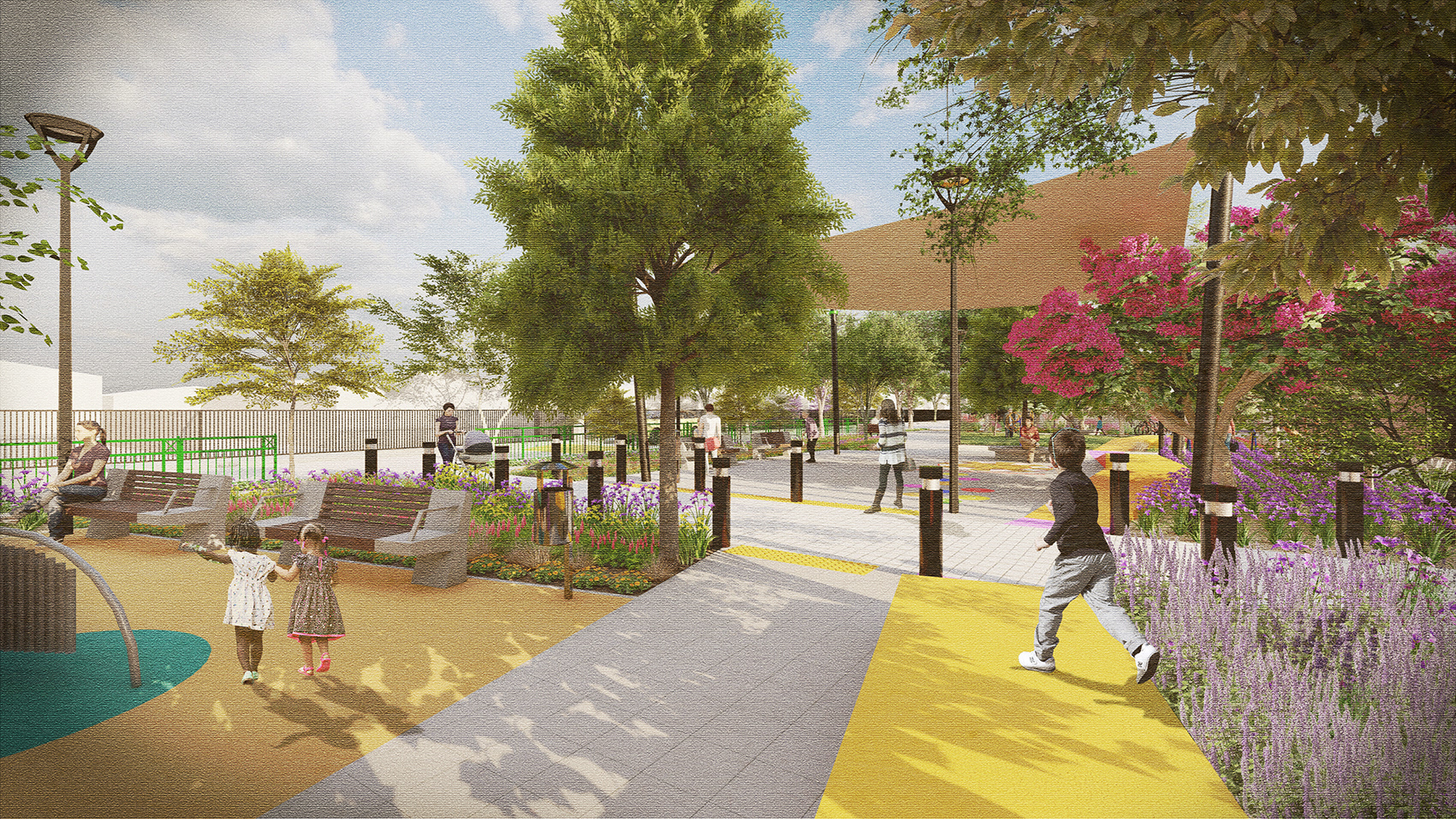 Para las plazas se proyecta un borde interno controlado hacia la vialidad, de manera de generar espacios más seguros para los niños. Así mismo, se trabaja sobre la accesibilidad y señalización de los cruces peatonales.