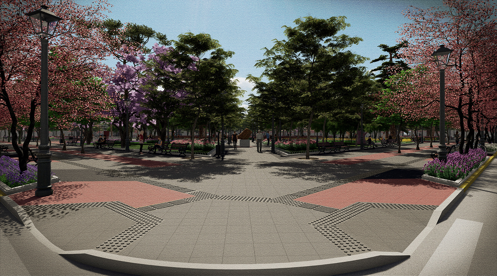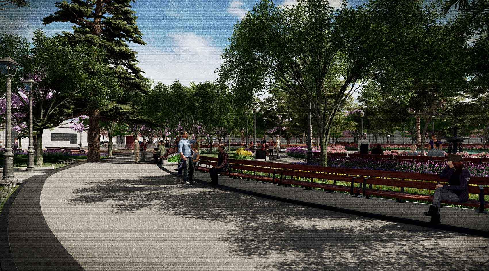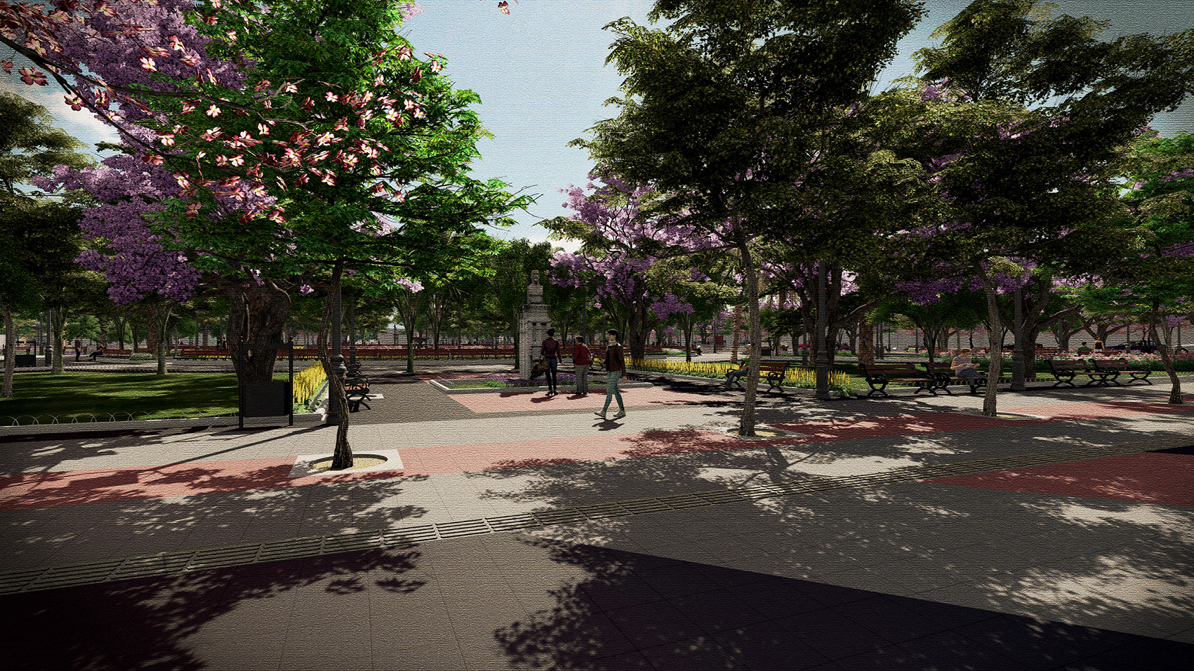 La estructura de circulación existente en el interior de la plaza se mantiene y potencia, con sus diagonales que cruzan la plaza y paseos en anillos concéntricos que conectan los monumentos y elementos escultóricos con los distintos puntos de interés. Estas circulaciones y zonas de estar incorporan nueva iluminación y mobiliario urbano, lo que permitirá conservar y reforzar su uso como espacio de encuentro social, contemplación y recreación para la comunidad de San Fernando.
