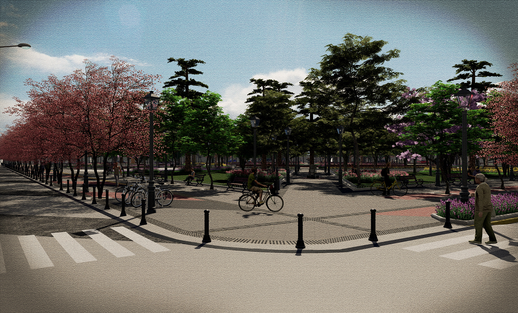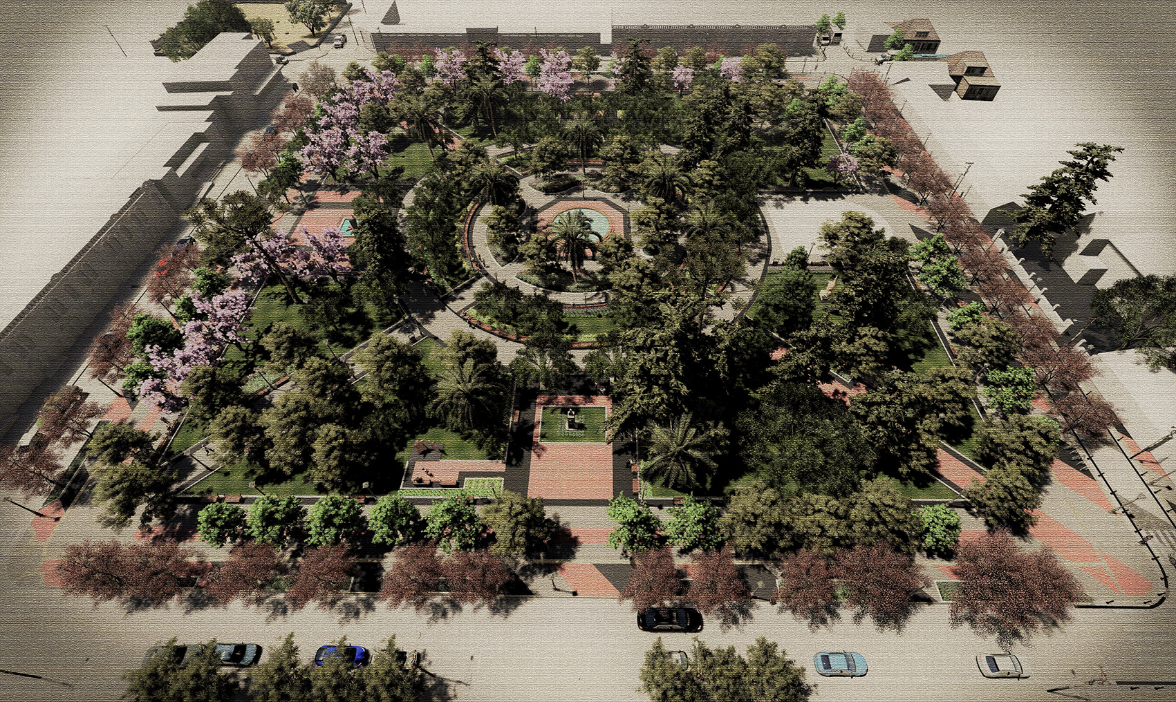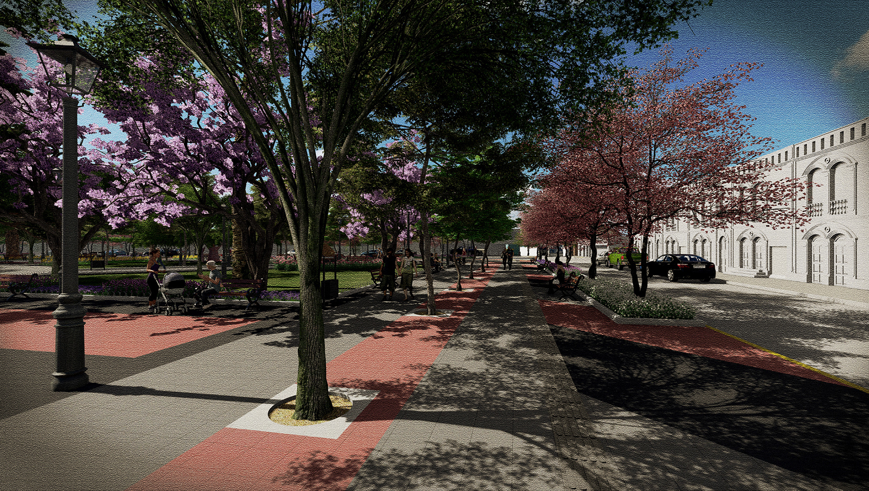 La estructura de circulación existente en el interior de la plaza se mantiene y potencia, con sus diagonales que cruzan la plaza y paseos en anillos concéntricos que conectan los monumentos y elementos escultóricos con los distintos puntos de interés. Estas circulaciones y zonas de estar incorporan nueva iluminación y mobiliario urbano, lo que permitirá conservar y reforzar su uso como espacio de encuentro social, contemplación y recreación para la comunidad de San Fernando.
